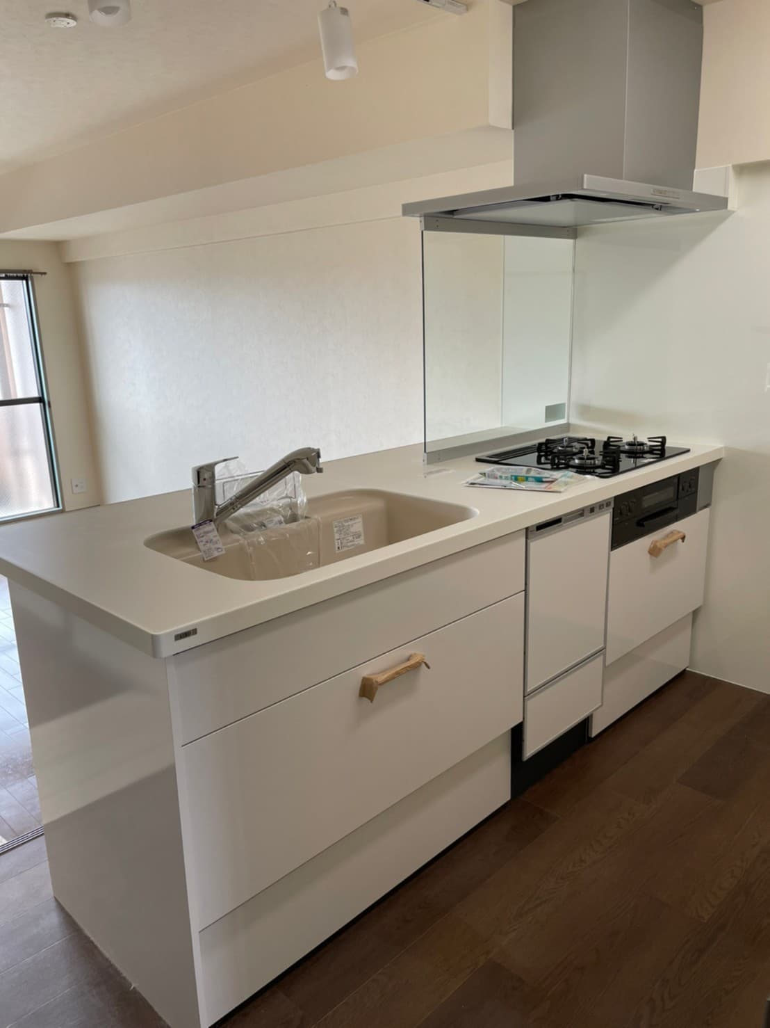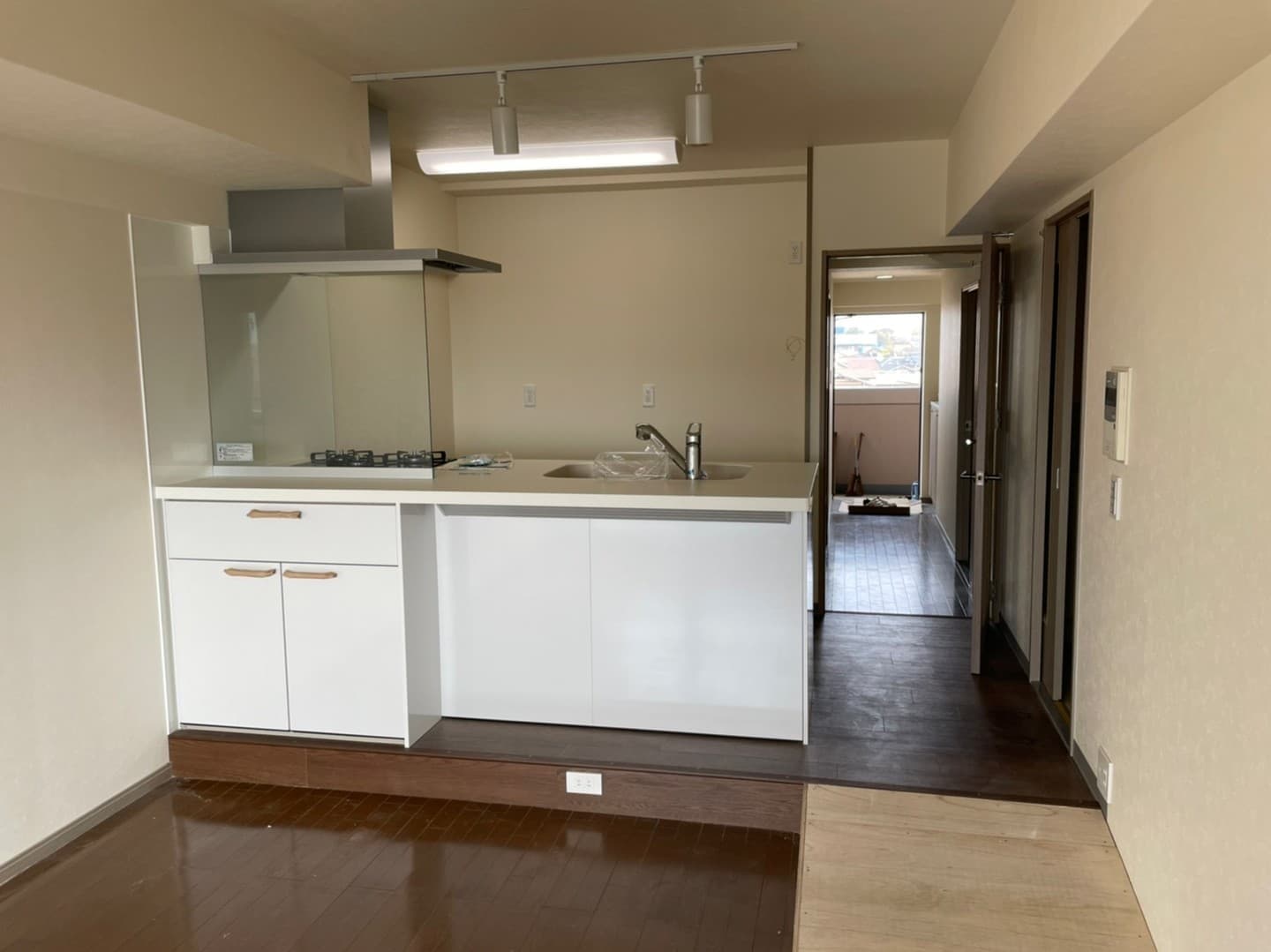 壁面にシンク・カスコンロ等が設置されていたキッチンを対面式にリフォーム。