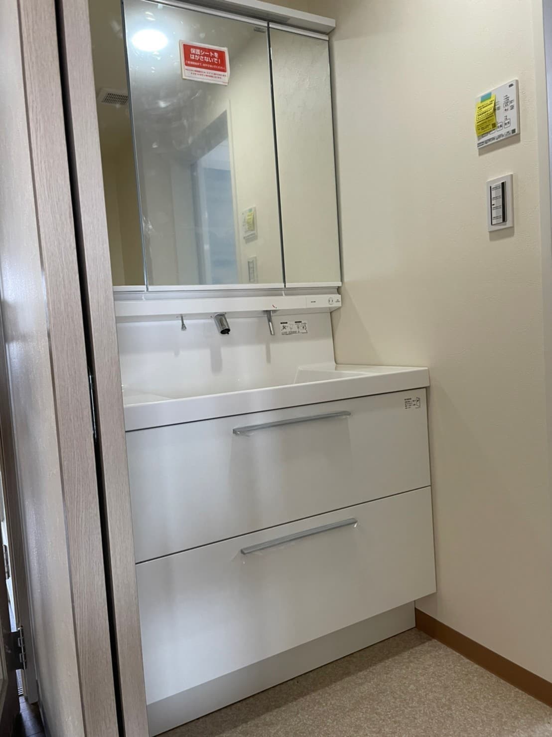 浴室を広くしたことで洗面化粧台のサイズを小さく致しました。壁にピッタリで隙間もなくなりお掃除も簡単。