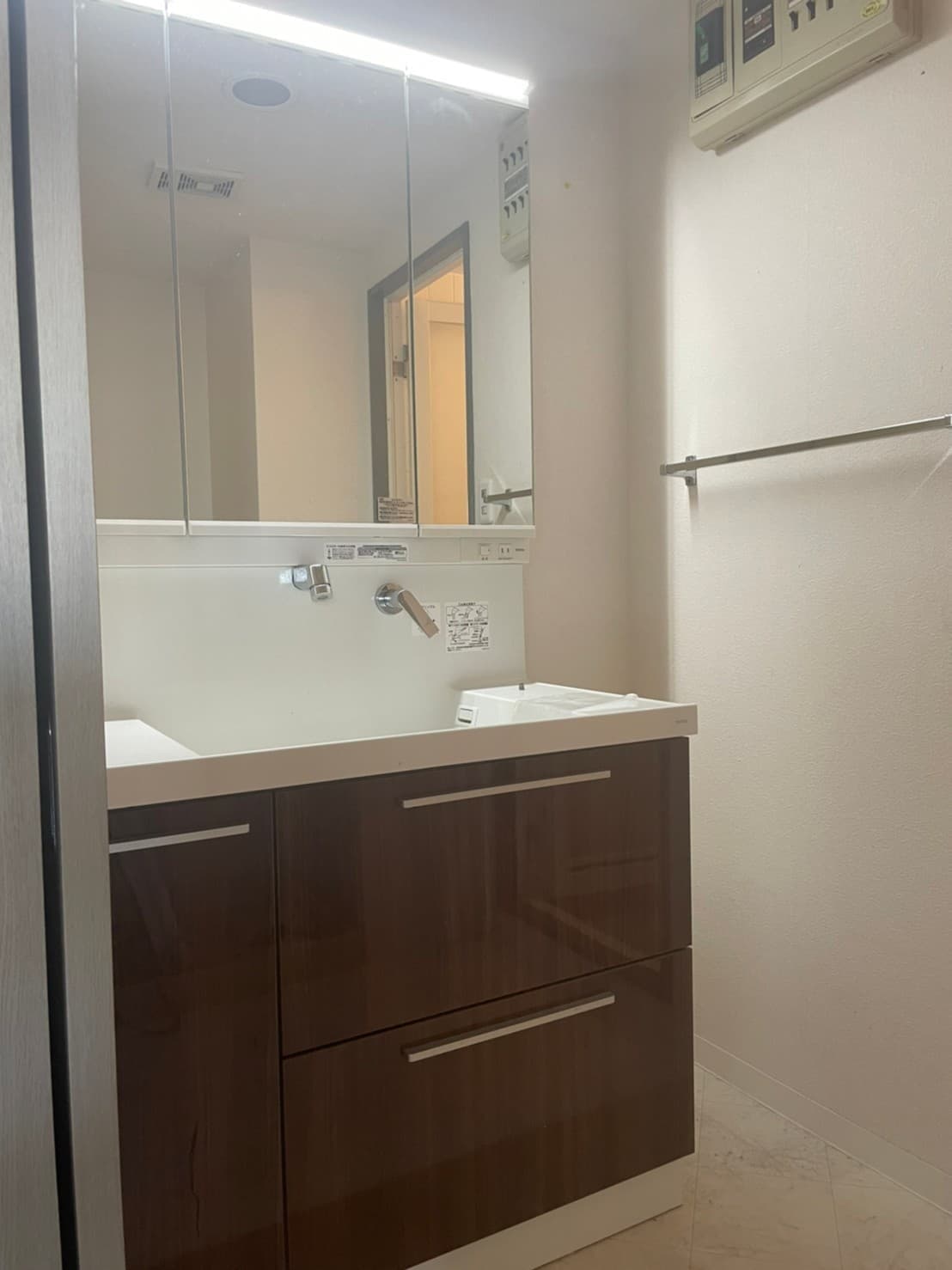 浴室を広くしたことで洗面化粧台のサイズを小さく致しました。壁にピッタリで隙間もなくなりお掃除も簡単。